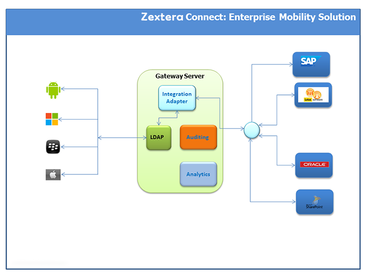 ZexteraConnect can drastically reduce the integration efforts with the back end application there by reducing the time to market for your mobility initiatives.ZexteraConnect includes middleware and front end mobile client application which can be deployed on multi OS devices.ZexteraConnect is designed based on the SOA principle using REST architecture can easily fetch data using configurable rules.